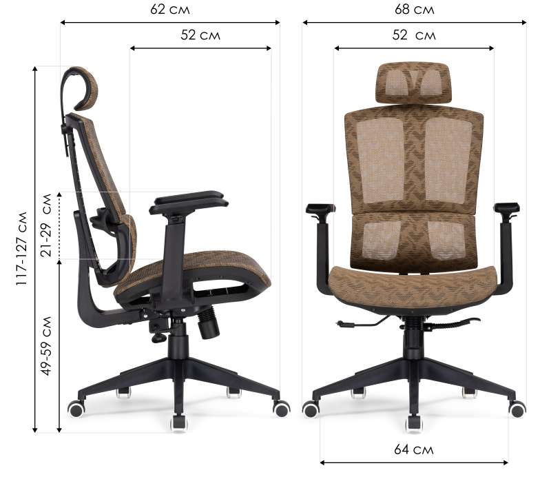 Подголовник и подлокотники дополнительно регулируются по высоте. Высота подлокотников: 21 - 29 см. Высота спинки: 73 - 78 см. Диаметр крестовины: 64 см.